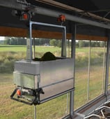 Voor het verdelen van strooiselproducten in ligboxen ontwikkelden we een innovatieve instrooier. Deze machine bestaat uit een verdeelwagen die zich automatisch over een railsysteem voortbeweegt en het materiaal boven de boxen verdeelt. De wagen is uitgerust met een 24V-batterij, die automatisch wordt opgeladen in de rustpositie.